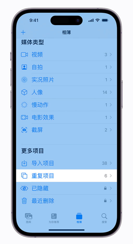 打开 iPhone 照片应用,在相簿“更多项目”中,可查看“重复项目”。