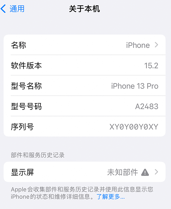 该提示表示,该设备在维修时使用了正品 Apple 部件,并按照流程完成。如果你的 iPhone 在接受服务后已连接到互联网,你可以轻点相应部件以获取更多信息,包括服务日期。