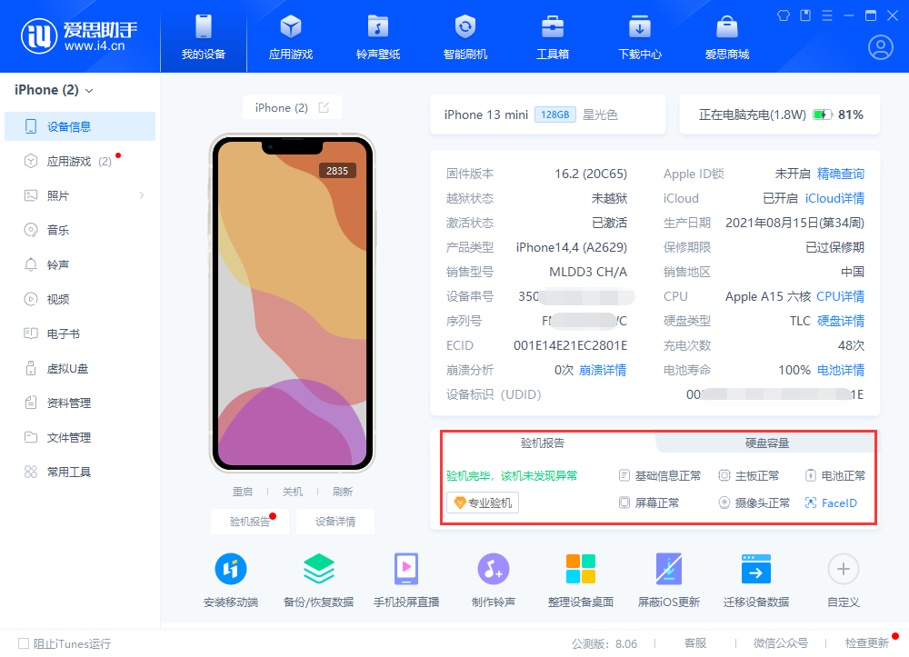有关该设备的更多详细信息,您可以通过数据线将iPhone连接到计算机,并使用Ace Assistant“检查报告”功能了解详细信息(单击此处查看Ace Assistant检查报告描述)。