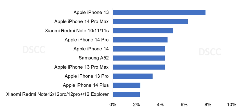 对于 2023 年 Q1,预计排名前五的机型是苹果 iPhone 14 Pro Max、iPhone 14 Pro、iPhone 13、iPhone 14?和三星 A54。这五款机型预计将占据 39% 的出货量份额和 50% 的智能手机设备收入份额。