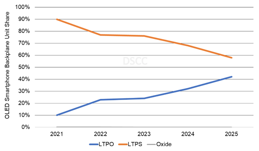 随着更多面板供应商的 LTPO 产能符合量产条件,LTPO 背板继续获得份额。LTPO 渗透率从 2021 年的 10% 上升到 2022 年的 23%。报告预计 LTPO 将继续增长并在预测期内实现超过 40% 的份额和 60% 的设备收入份额。LTPO 的增长是对更高刷新率和 AOD 显示的强烈需求的结果。苹果于 2021 年在?iPhone 13 Pro?和 Pro Max 上采用了 LTPO 面板技术。2025 年,随着 LTPO 产能持续上升和成本下降,DSCC 预计苹果所有 iPhone 17 系列机型都将采用 LTPO 面板。