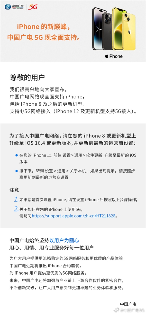 iPhone 8及以上机型使用中国广电5G方法: