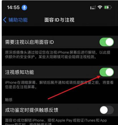 开启设置>辅助功能>面部ID和注视,并开启注视感知。