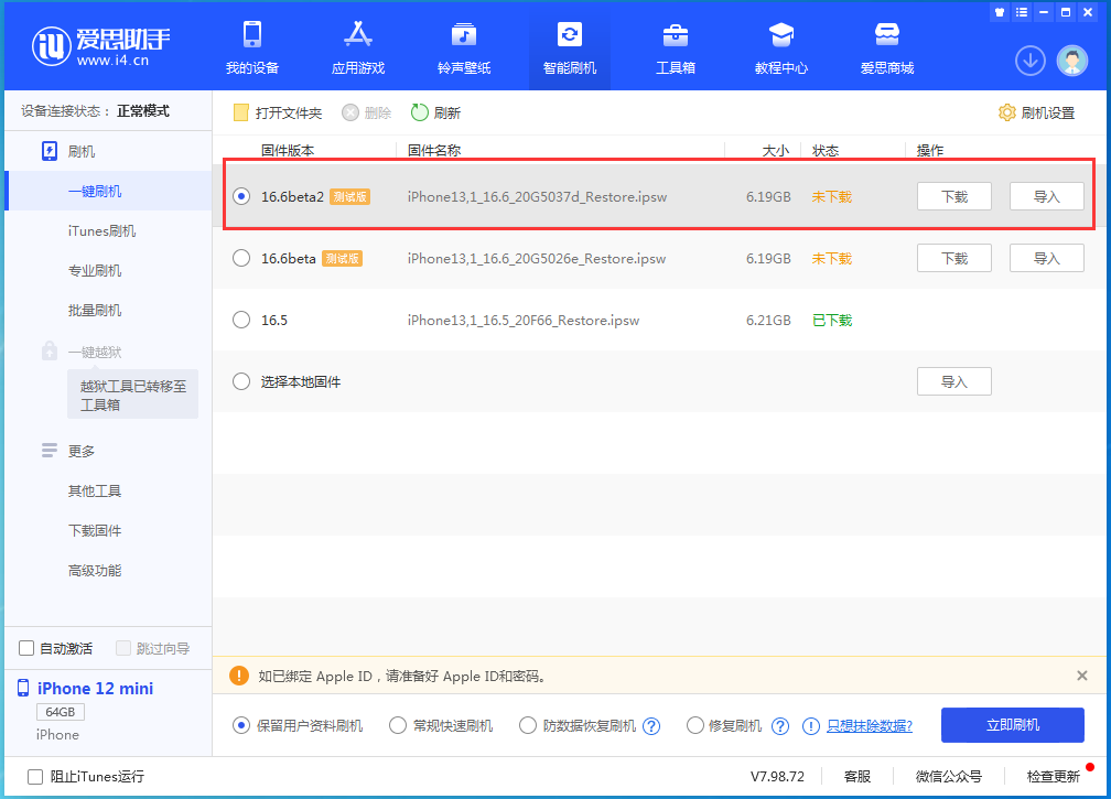 开启爱思助手 PC 端(需更新到最新版),将 iOS 设备邻接至电脑。在爱思助手 “智能刷机”-“一键刷机” 界面,选择 16.6 beta2,勾选 “保存网友数据刷机” 选项,点击 “顿时刷机” 并耐性期待刷机完成便可。