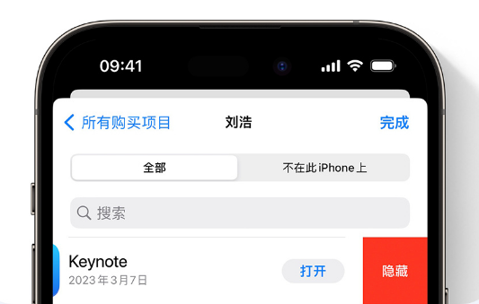 如果想要将购买的项目保密,可以在 Apple Store 中点击你的头像,然后轻点“我的购买项目”,找到要隐藏的 App,向左轻扫并轻点“隐藏”即可。