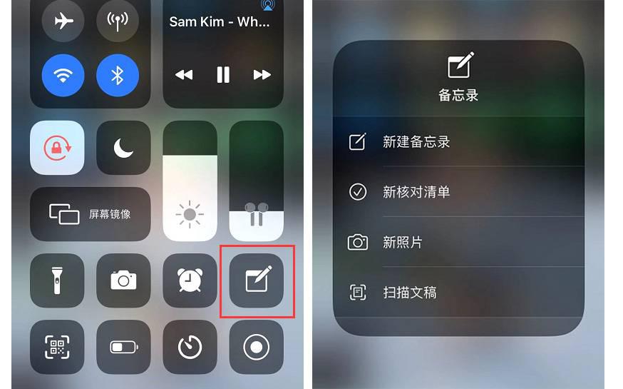 打开控制中心,点击“备忘录”图标即可快速新建。在 iOS 13 或更新版本中,您还能长按备忘录图标,选择更多项目,例如新建一个核对清单。