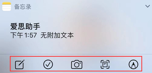 以上界面中的图标分别是:新建备忘录、新建备忘录清单、拍照到备忘录、扫描文稿以及涂鸦功能。