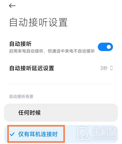 5、启动自动接听功能后,在自动接听场景设置下方点击“仅有耳机连接时”即可。