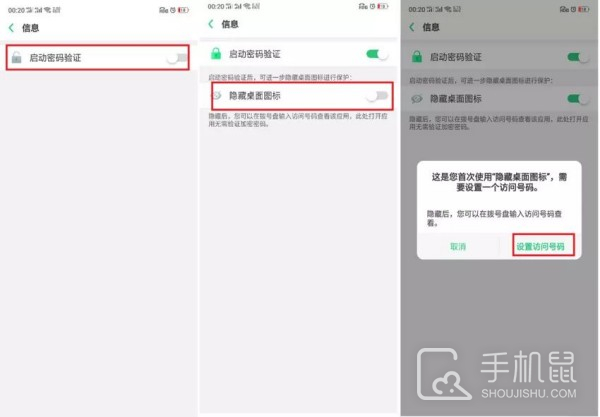3、在应用加密界面,打开启动密码验证,开启隐藏桌面图标就可以顺利隐藏了