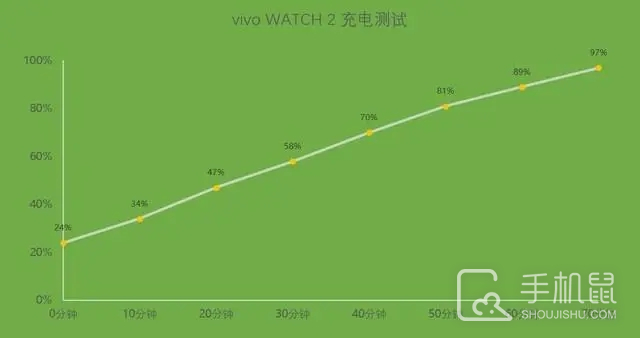 官方给出的数据是在25℃以下的环境,充满的时间在2小时内。我们将这块还剩24%(约)的手表进行的充电时间的测试,由24%直至充满耗时74分钟。
