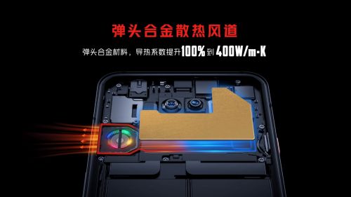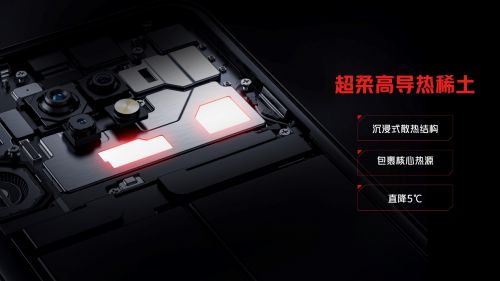 为了更好发挥出全新一代骁龙8移动平台的极限性能优势,红魔7系列在散热方案上也做到了极致。全新升级的ICE魔冷散热系统,由高速离心风扇、4124mm?超大VC散热板、航天级散热材料、超柔高导热稀土等组成9层散热结构,打造全行业首款散热材料面积高达41279mm?的游戏手机。其中,超柔高导热稀土配合转速高达20000转/每分钟的主动散热风扇将热量带走,核心热源温度同比上一代,直降3℃!航天级相变材料石墨烯+正二十一烷更是将导热系数提升400倍,配合金属材质的峡谷风道及新增背部45°角开孔形成双进风口,换气效率大幅提升,最高温度下降2.4℃!成就了目前业界最精密、最强大散热方案。