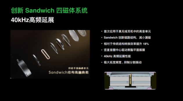 高音单元则延续OPPO高端耳机平面振膜的家族特征,平面聚酯振膜能够极大拓宽频宽, 抑制分割振动,使高音更加细腻、亮丽;全新定制的Sandwich四磁结构首次应用于真无线耳机中的高音单元,可实现40kHz高频延展性,相对于传统结构,转换效率提升18%,在有限空间内能够极大提升效率,减小漏磁;30um直径的超轻超CCA扁平音圈,将振动质量降到极致,高频细节分毫毕现。