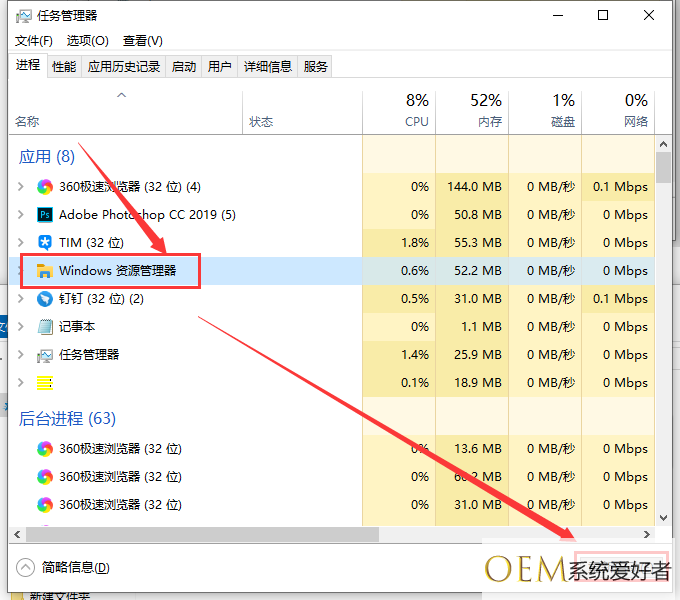 2.在列表中找到【资源管理器】并选中,然后选择右下角的【重新启动】