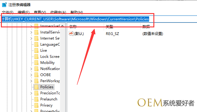 2.弹出【注册表编辑】窗口,在窗口定位到【计算机HKEY_CURRENT_USERSoftwareMicrosoftWindowsCurrentVersionPolicies】注册表项