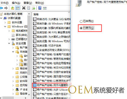 3、“win+r”打开运行,输入gpedit.msc进入组策略,依次选择“计算机配置”、“windows设置”、“安全设置”、“本地策略”、“安全选项”,www.xitonghe.com/win10/ 在右侧下拉选择“用户账户控制:以管理员批准模式运行所有管理员”,双击它。选择“已禁用”,重启即可关闭用户账户控制。