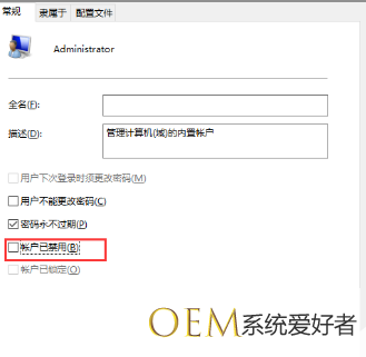 3、双击该帐户,取消勾选“此帐户已禁用”选项,然后应用即可