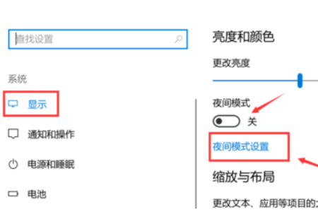 2、进入显示设置页,右侧可看到夜间模式开关,通过切换即可按照设置的规则,启动此模式,这里点击开关按钮下方此模式设置按钮。