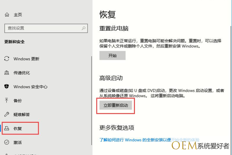 2、点击“恢复”,点击“立即重新启动”。