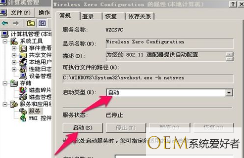 4、在打开的属性窗口中将启动类型改为自动,服务状态改为启动,点击确定