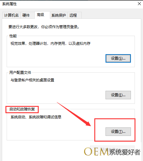 3、打开【高级系统设置】窗口,切换到【高级】选项卡,单击“启动和故障恢复”的“设置”按钮。如图所示。