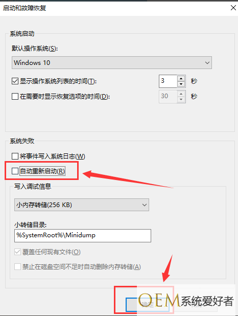 4、在“系统失败”选项下将【自动重新启动】的复选框去掉,也就是去掉勾,然后点击“确定”按钮,使系统设置生效。
