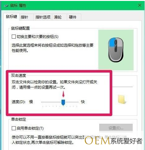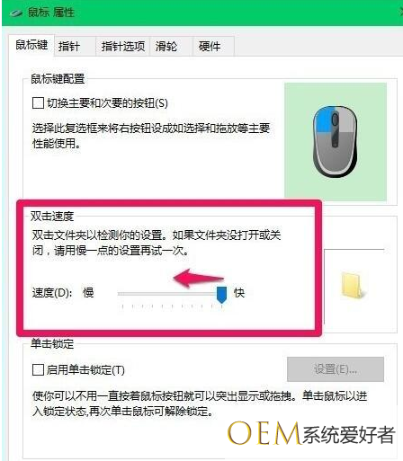 3.在鼠标属性窗口中,我们可以看到鼠标的双击速度为[Fast],使用鼠标左键按住小滑块并将其移至中间位置。