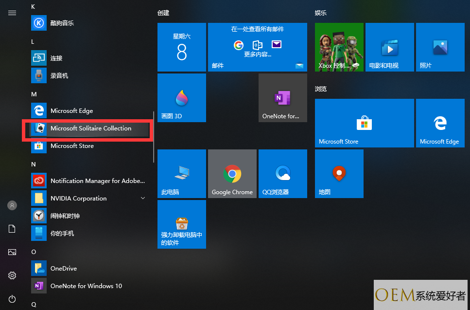 1、点击桌面左下角菜单,找到“Microsoft Solitaire Collection”,点击进入。