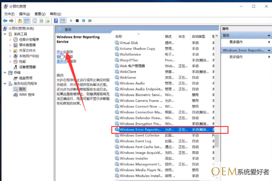2、进入后在服务和应用程序--服务里找到图中红框中的程序,选中后点击“停止此服务”。