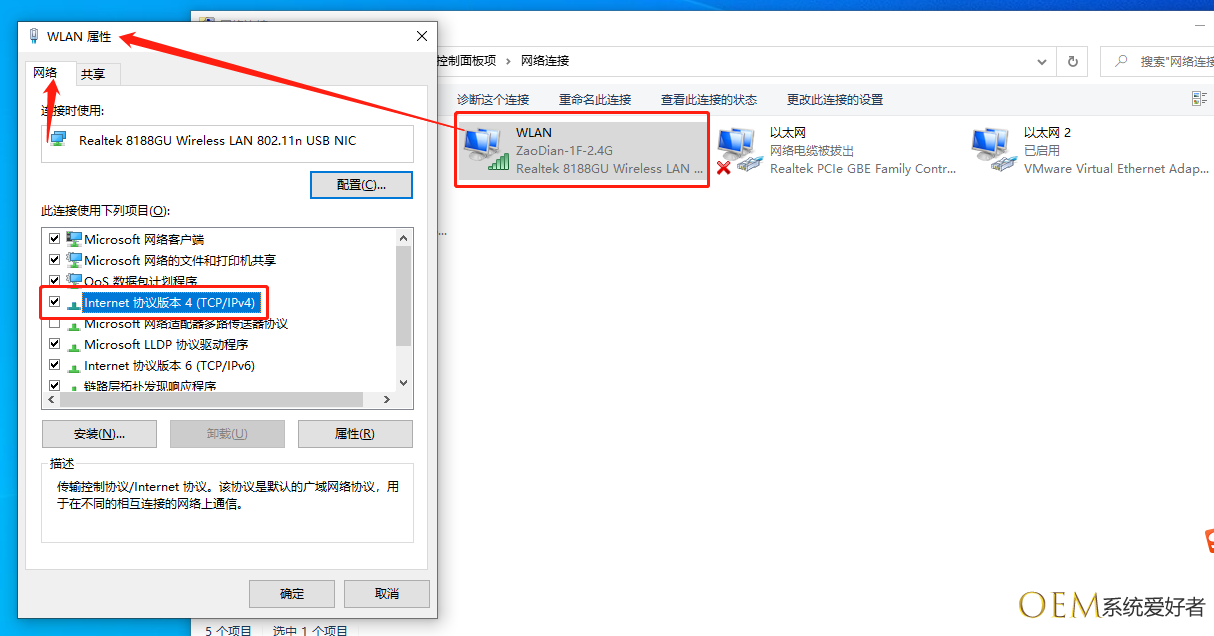 3、打开正在使用的网络的属性,在网络中找到协议版本4,双击打开.