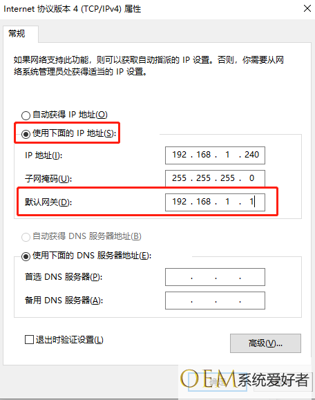 4、点击使用下面的IP地址后,我们就可以设置默认网关了。
