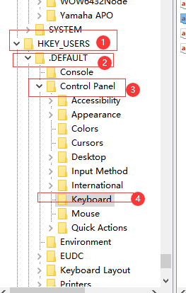 3、进入页面后依次点击“HKEY_USERS > .DEFAULT > Control Panel > Keyboard”。