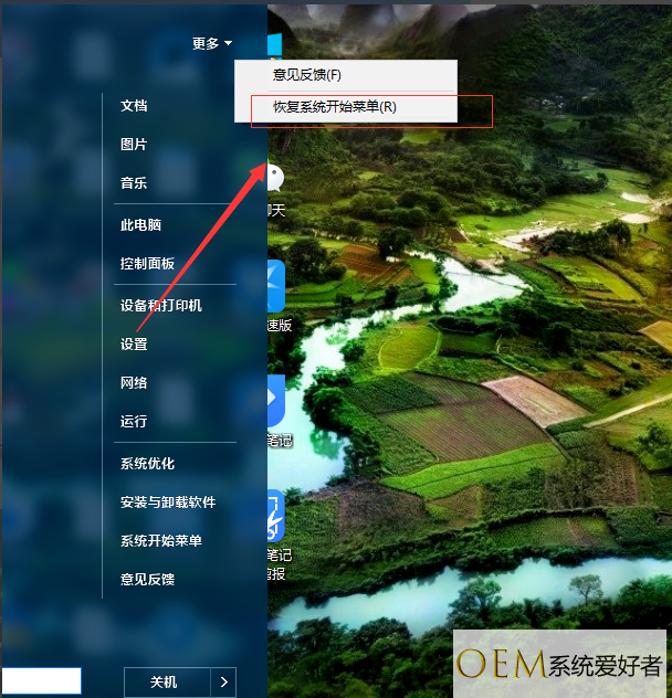 5、当然如果想恢复的话,也可以点击菜单上方的”更多“,在点击”恢复系统开始菜单“。