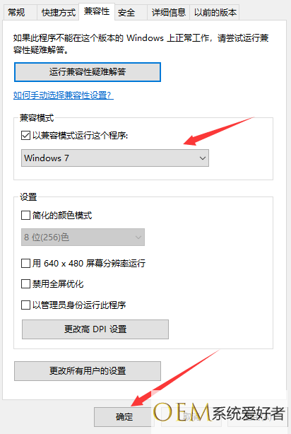 2、我们进入到属性页面后,我们勾选以兼容模式运行这个程序前面的复选框,并选择windows7选项,然后点击确定即可。
