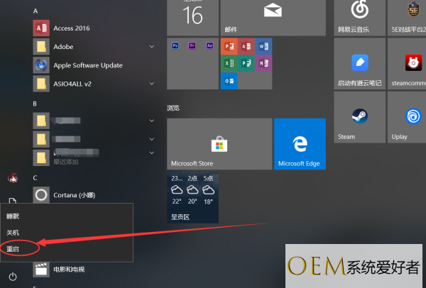 3,此时打开开始菜单,点击重启按钮,重启电脑即可解决。