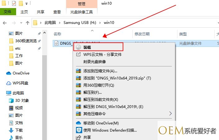 1.在文件夹中,找到你下载好的win10系统,鼠标右键该系统文件,选择【装载】。