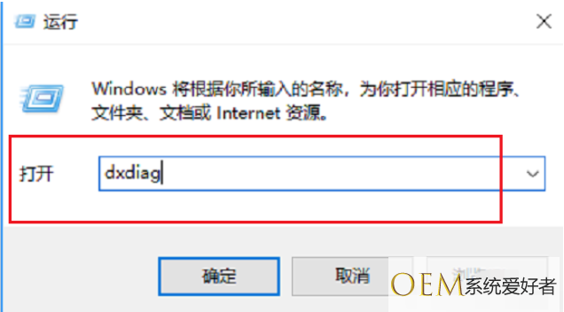 1、同时按下win+R键打开运行,输入“dxdiag”,点击确定
