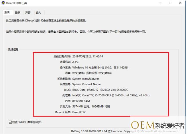 2、进去DirectX诊断工具之后,在系统界面,可以看到当前电脑的基本配置信息