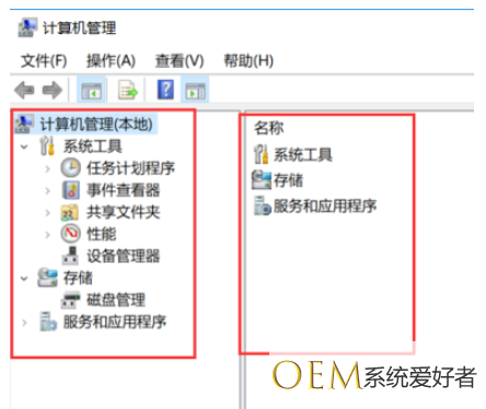 2、进入管理选项之后,我们可以看到以下选项包括,系统工具,任务计划程序,事件查看器,共享文件,性能,设备管理器等。