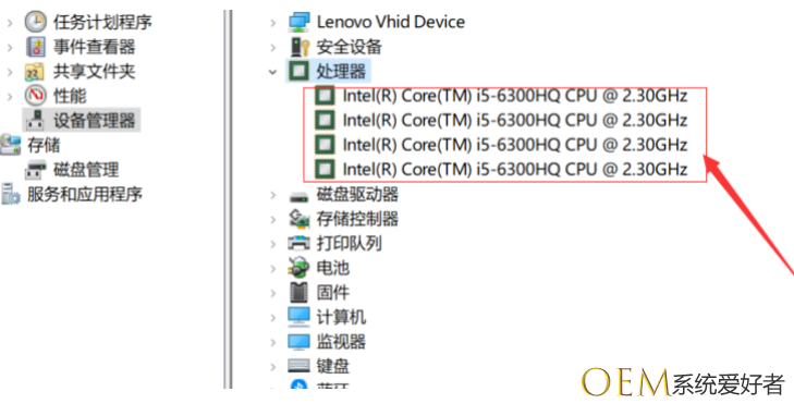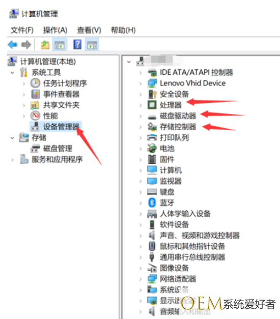 3、我们首先点击设备管理器,可以看到设备管理器主要包括处理器,磁盘驱动器,存储控制器和显示适配器。