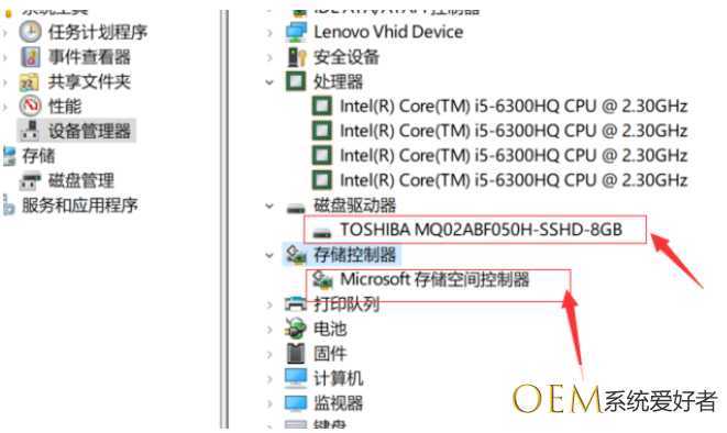 5、接着我们来看磁盘驱动器和存储控制器。可以看到小编的磁盘驱动器是东芝公司出产的混合硬盘,包括8gb的SSD和500g的HHD。