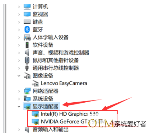 6、接着我们点击显示适配器显示适配器一般有两种,第一个是集成显卡,第二个就是独立显卡。可以看到小编的电脑有英特尔的集成显卡,还有英伟达公司的GTX950m独立显卡。