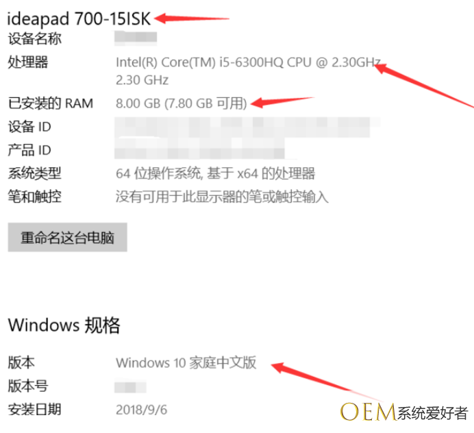 8、点击系统属性之后我们向下翻阅,可以看到自己的设备型号,处理器,已安装的ram,产品id,设备ID等信息。