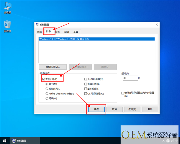 3、弹出【系统配置】窗口,选择【引导】勾选【安全引导】再点击【确定】