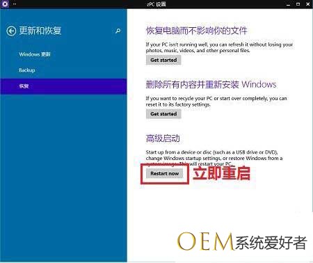 3、在更新和恢复界面,点击左侧恢复(Recovery),在右侧窗口找到高级启动(Advanced startup)项目下面的立即重启(Restart now),点击立即重启电脑。