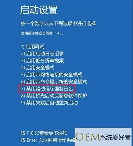 8、电脑会再次重启,重启后在启动设置界面,点击“禁用驱动程序强制签名”就可以了。