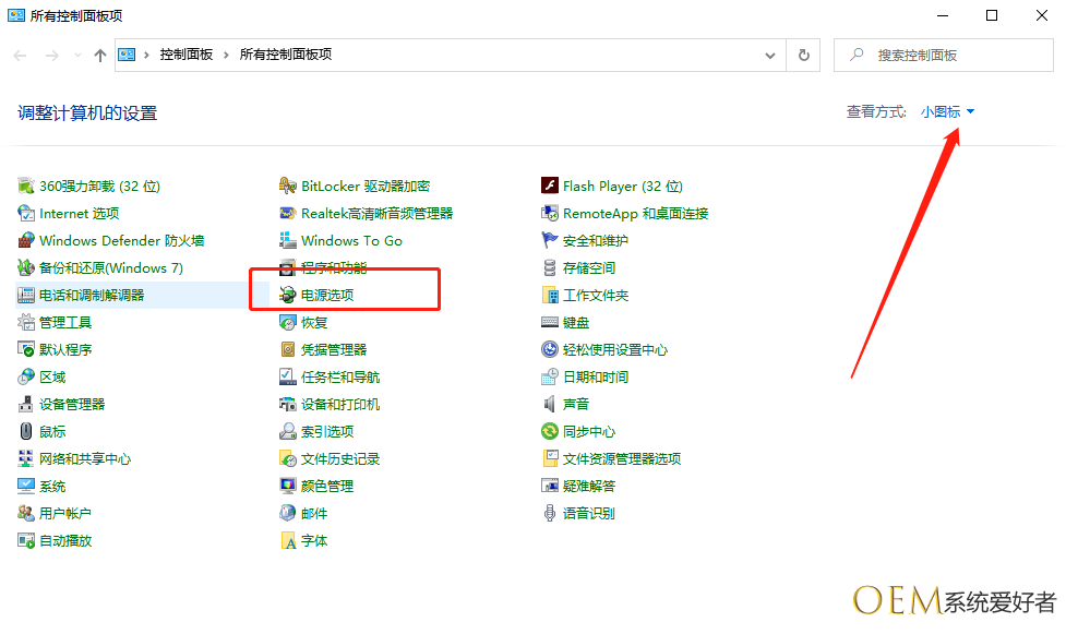 2、将查看方式改为“小图标”,点击“电源选项”进入。