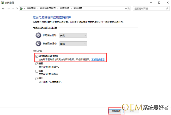 5、勾选“启用快速启动”,点击“保存修改”,然后重启电脑看看。