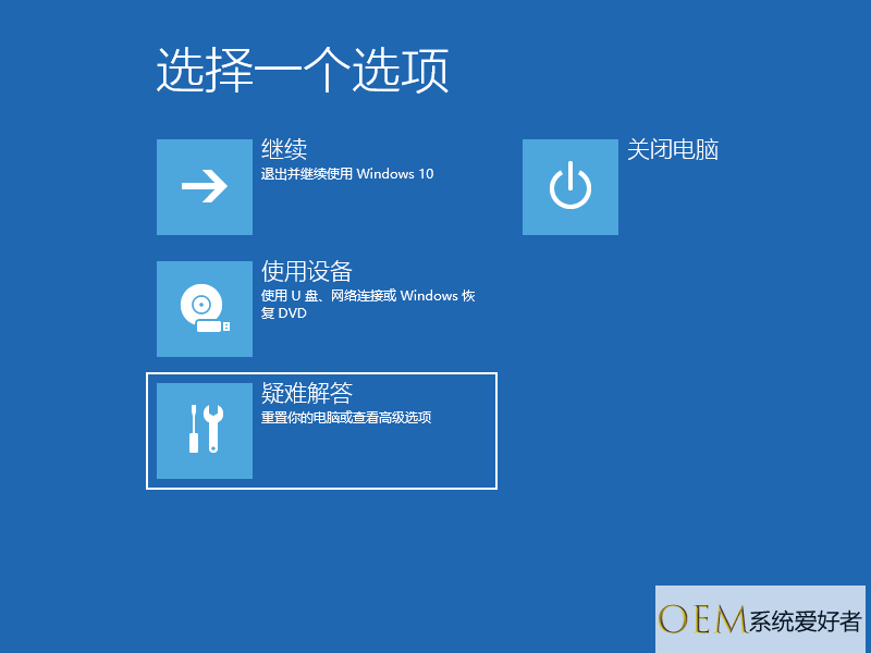 1、开机无法进入系统,可长按电脑【电源】键强制关机,再按【重启】键开机,连续三次及以上时,电脑进入【选择一个选项】的系统菜单界面,点击【疑难解答】,打开【高级选择窗】窗口;
