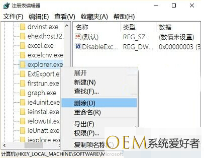 2、再打开后的注册表编辑器,依次展开并定位到HKEY_LOCAL_MACHINESOFTWAREMicrosoftWindows NTCurrentVersionImage File Execution Options,再展开Image File Execution Options,在其下找到explorer.exe,右键删除。