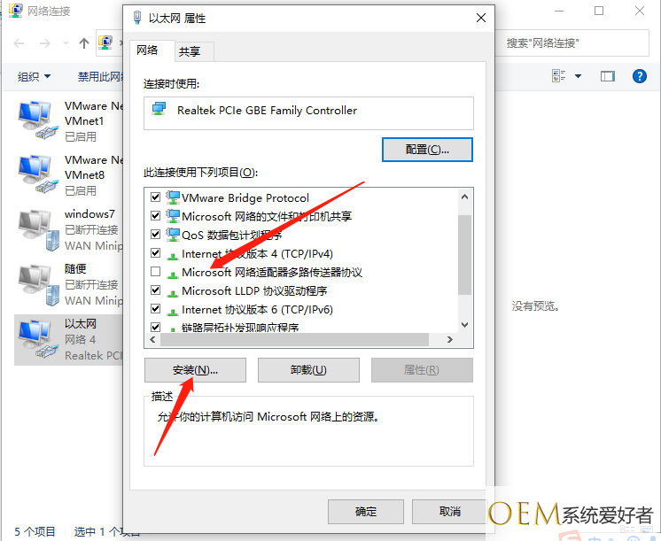 3、在网络设置对话框,找到--Microsoft网络适配器多路传送协议--选择,然后点击左下角--安装--;